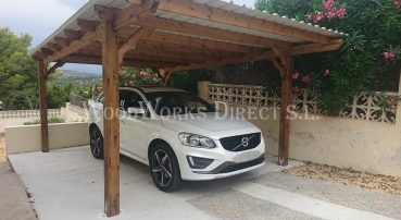 The perfect protection for your car. Here's a 6m x 4m Carport with chunky posts, shaped braces and our sun reflecting roof sheets. All treated in Golden Brown. Javea.